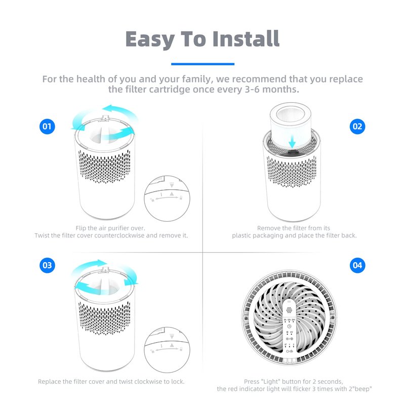 - Prevent Clogging: When hairs, dander, and other large particles meet the pre-filter layer, they will be captured them and keep it outside to prevent the air purifier from clogging.