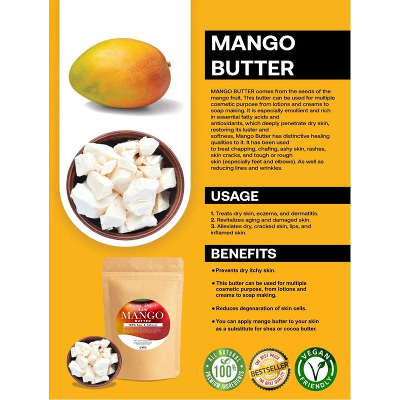 emollient, making it highly effective in nourishing and moisturizing the skin. It is well suited for use in body care products, such as body butter, massage creams, balms, and salves. It is an ideal ingredient to use in skin care and suntan preparation and a super fatting agent in soap. Unlike other butter like shea butter and cocoa butter, mango butter has a wound healing quality. It has been used to treat chapping, chafing, ashy skin, rashes, skin cracks, and rough skin (especially feet and elbows). As well as reducing fine lines and wrinkles. Ideal for Do-It-Yourself Beauty Recipes Our odorless Mango Butter has a higher fatty-acid content than Shea and Cocoa butter, and is softer at room temperature, making it ideal for DIY beauty recipes. It is also rich in vitamins A, C, D, and E, and in B vitamins, yet delicate, making our Mango Butter ideal to nourish the body, the face and hair. Benefits of our Mango Butter Rich in Vitamin C, our Mango Butter promotes collagen production. This strengthens the skin and reduces sagging. Apply Mango Butter on scrapes and small wounds to speed up the healing process. Rich in antioxidants, anti-inflammatories, and skin regenerators, Our Mango Butter can help fade stretch marks and acne scars. A natural source of Vitamin A, our Mango Butter can help minimize wrinkles. Mango Butter soothes insect bites. A major moisturizer, our Mango Butter can help treat dermatitis, psoriasis, and eczema with regular application. Use Mango Butter to hydrate your hair. Protect your scalp by applying it before and after sun exposure. Application: Cut a small piece rub it in between your palms, the butter will melt instantly with body heat. A small piece can go a long way. Caution: This butter is not whipped it a firm solid butter.