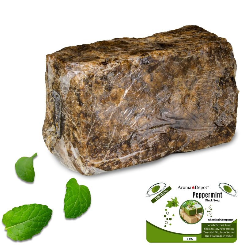 Indulge in the luxurious experience of Aroma Depot's Peppermint Black Soap. This handcrafted 8 oz. bar is infused with the invigorating essence of peppermint essential oil, blended with nourishing ingredients like shea butter, palm kernel oil, and vitamin E. Crafted using traditional methods, this soap gently cleanses and refreshes your skin, leaving it feeling soft and revitalized. The rich, creamy lather envelops your senses with peppermint's cool, minty aroma, creating a truly rejuvenating bathing ritual. Perfect for use as a facial cleanser or an all-over body wash, this soap is a natural indulgence for your daily skincare routine. Treat yourself to the revitalizing power of Aroma Depot's Peppermint Black Soap.
