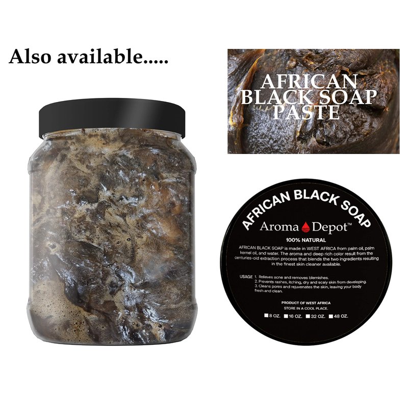 African Black Soap is a versatile skincare product suitable for all skin types, including dry, rough, oily, and moderate surfaces. It offers numerous benefits such as soothing skin irritations and reducing acne scars. Additionally, it can alleviate discomfort associated with skin conditions like psoriasis and eczema. The regular use of black soap also helps minimize early signs of aging, such as facial lines, thereby promoting youthful-looking skin. This multi-purpose soap can be used on the body, hair, feet, hands, and face. It is beneficial for various skin concerns, including eczema, psoriasis, stretch marks, acne, rashes, dry skin, itchy scalp, and sensitive skin. Moreover, it provides hydration and nourishment to the skin.
