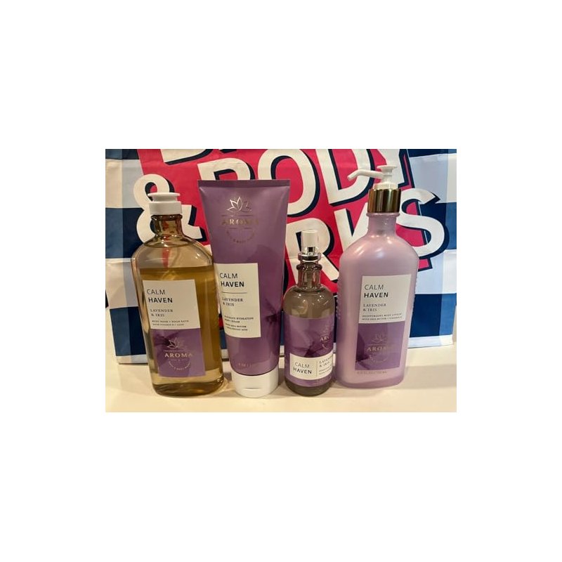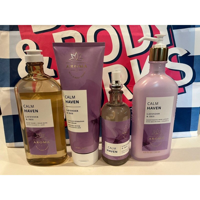 AROMATHERAPY "AROMA" CALM HAVEN LAVENDER & IRIS: 1) BODY WASH / FOAM BATH 10 OZ 1) BODY CREAM 8 OZ 1) ESSENTIAL OIL MIST 5.3 OZ 1) BODY LOTION 6.5 OZ ALL BRAND NEW, NEVER USED.