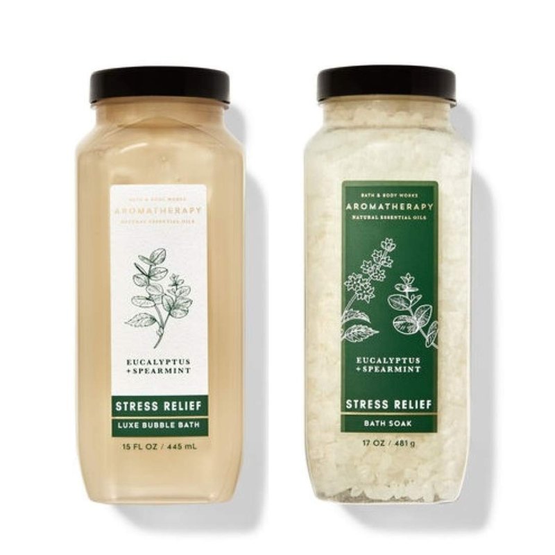 Bath and Body Works - Aromatherapy - Stress Relief - Eucalyptus Spearmint - Bubble Bath & Bath Soak – Gift Set - 2020 - Eucalyptus oil clears the mind. Spearmint oils soothes and uplifts. Eucalyptus Spearmint Bubble Bath - 15 fl oz - This ultra-relaxing and soothing bubble bath made with aloe creates the ultimate ritual that will leave skin feeling clean, soft and smooth. Eucalyptus Spearmint Bath Soak - 17 oz - Made with purifying sea salt, this therapeutic bath soak creates a gentle, calming bath.