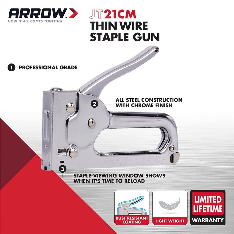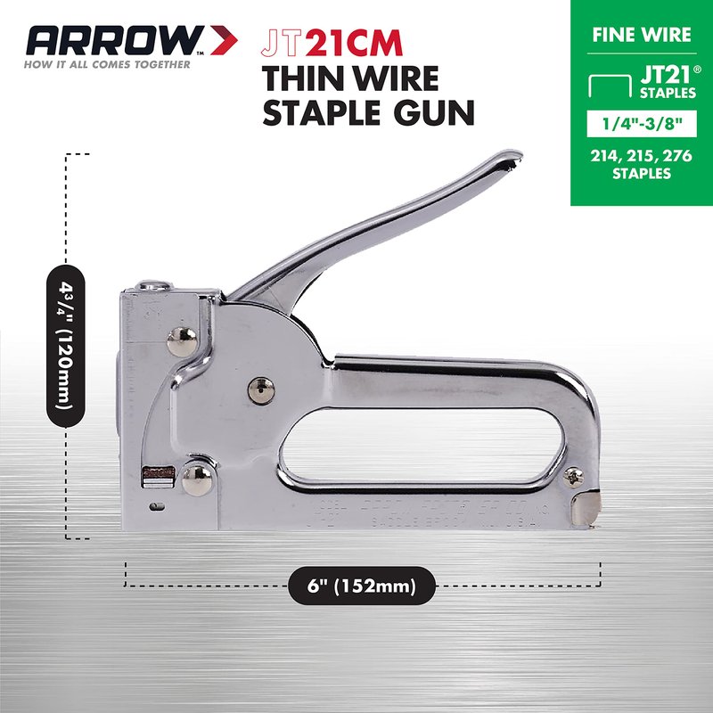 - CHOOSE THE RIGHT STAPLES: This tool uses Arrow JT21 staples (sold separately) in 1/4-Inch, 5/16-Inch, or 3/8-Inch; JT21 staples utilize a thinner wire in a smaller staple format to deliver great holding power; JT21 staples are a favorite with crafters, DIYers, and those with limited grip strength
