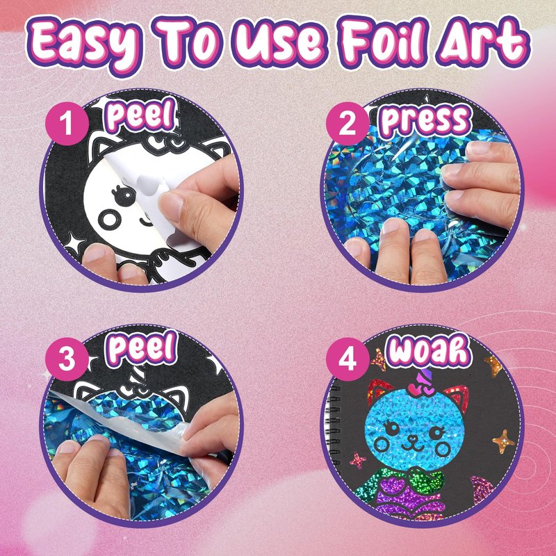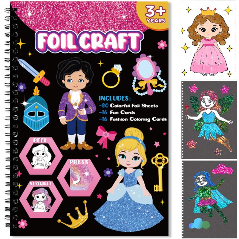 - Package Included: you will get a notebook(9.4x6.3inch) have 1 page instruction manual,16 foil craft cards and 16 drawing color cards, and 80 colorful foil sheets, 2 wooden pens.Our art craft activity kits provides a step by step guide to have fun,children will peel,press to dress up the princess,mermaid,drawing and play games to build confidence developing new skills,as while making beautiful DIY art craft.