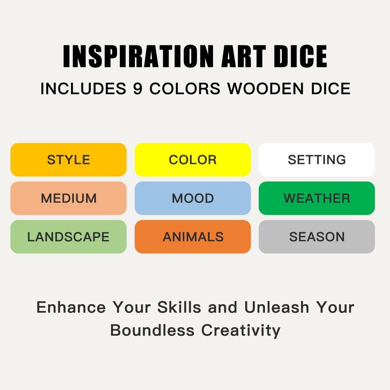- 【Enhance Your Skills and Unleash Your Boundless Creativity】Art Dice empowers you to transcend the confines of familiarity, embracing diverse mediums, styles, subjects, moods, textures, settings, and colors.