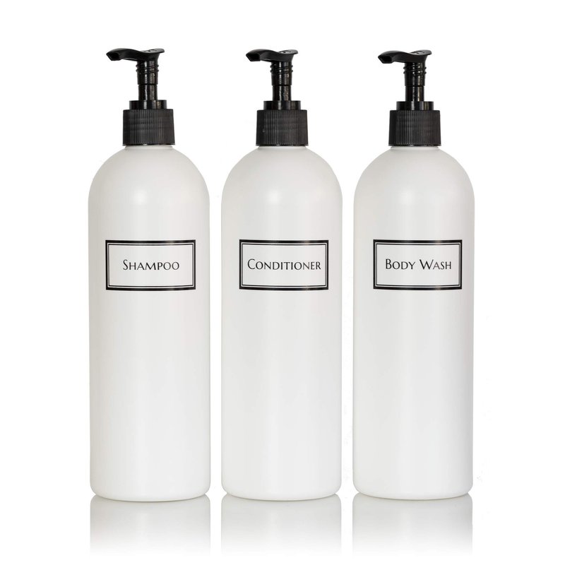 Artanis Home Silkscreened Empty Shower Bottle Set for Shampoo, Conditioner, and Body Wash, Cosmo/Bullet 16 oz 3-pack, White (Black Pumps)
