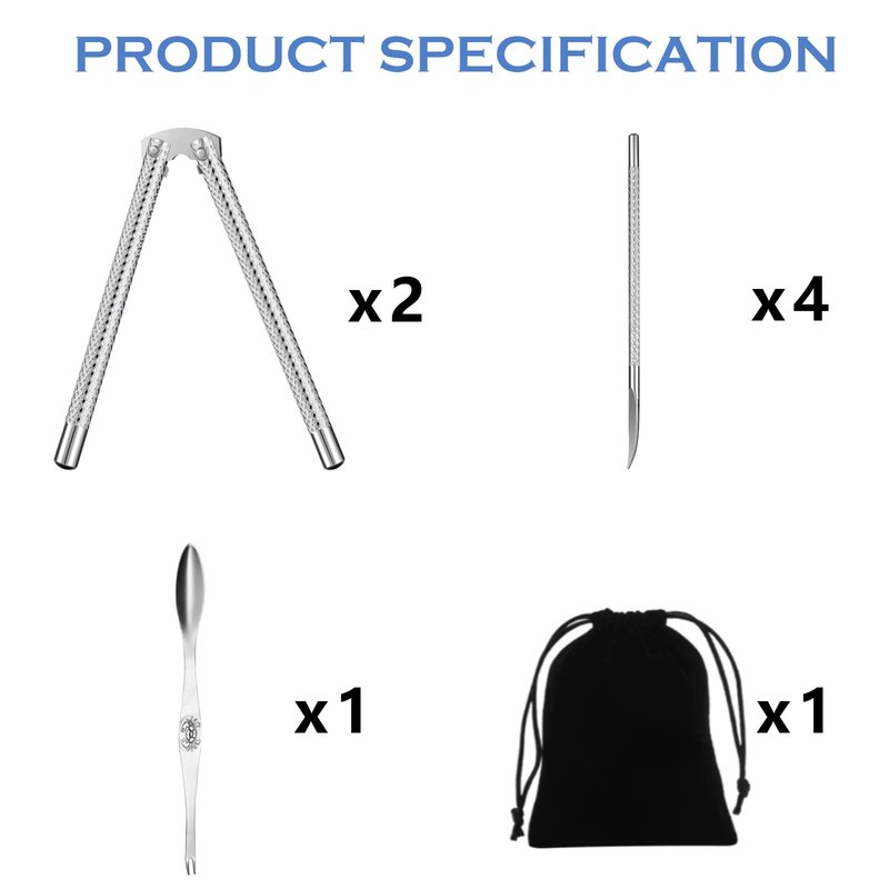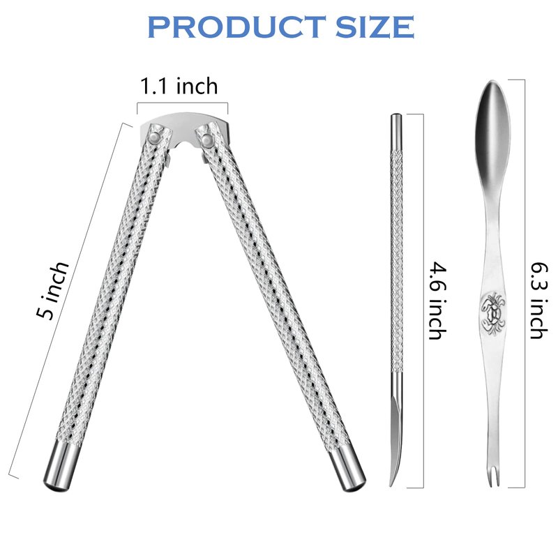 - This stainless steel set includes 2x nut cracker, 4x picks, 1x wide crab fork and 1x storage bag.