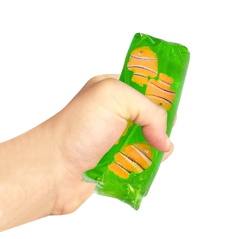 - GLITTERY DESIGN: A beautiful display of creativity and durability. Our fidget toys for kids feature orange, blue, or green liquid with glitter & clown fish figurines inside. Our water wigglers are slippery, elusive, and almost impossible to control. But that’s the fun of it all!