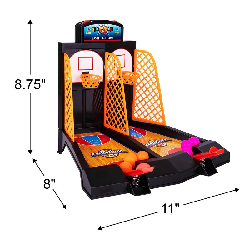 8.75” tall, 11” wide, and 8” deep, and 6 balls to fuel hours of play. Whether for a kid or an adult, this tabletop basketball game ensures hours of excitement.