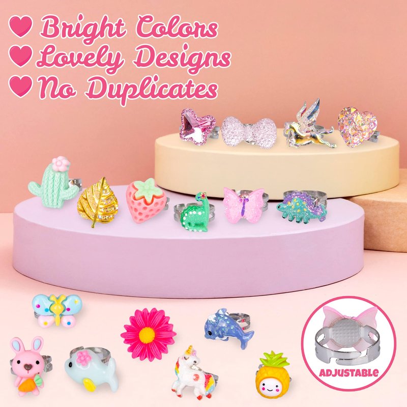 - NO DUPLICATES: Your little princess is unique. So are all the girl jewelry rings for kids in this set! We’ve ensured In the little girls ring set that there aren’t any duplicates. You’ll find every style ring for kids girls, from jewels, unicorns, flowers, fruits, rainbows, and animals, to so much more all toddler rings for girls.