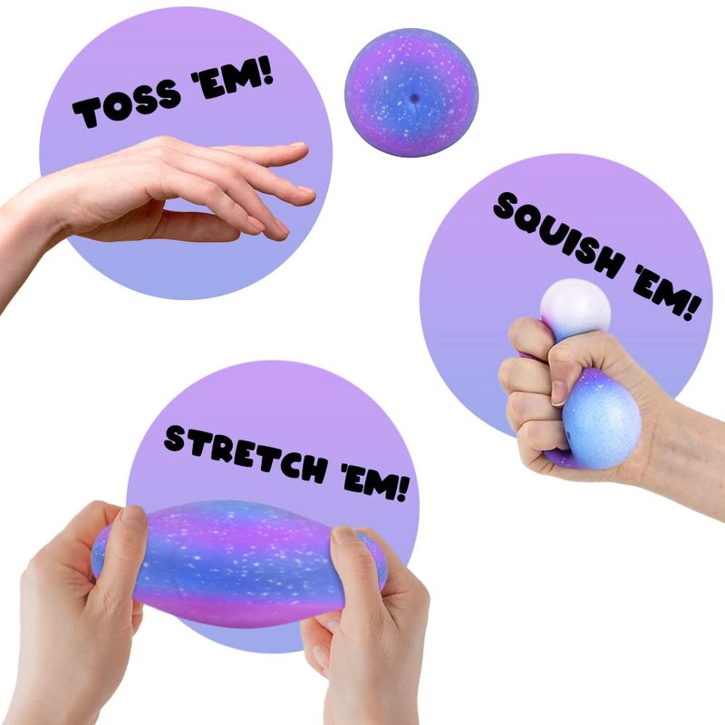 - STRETCHY STRESS RELIEF: Squeeze, stretch, and smoosh the anxiety away! These super-stretchy stress balls are a recipe for calming, smile-sparking fun. Each of the stretchy ball toys measures 2.5” for ultra-portable fidgeting goodness. For kids ages 3+
