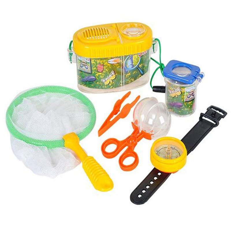 a success: a butterfly net, wrist compass, transfer capsule, tweezers, and 2 types of bug carriers with 3X magnification viewing