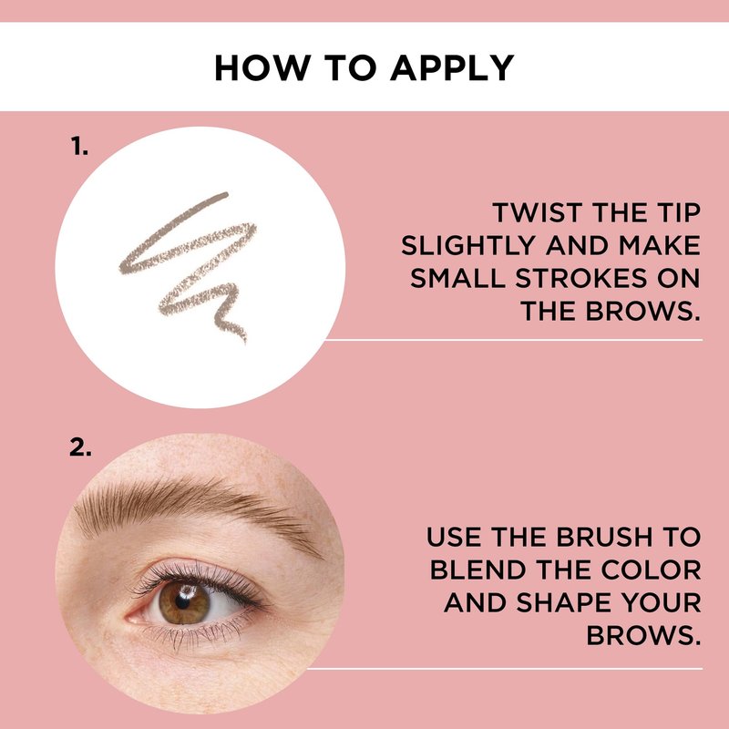 - APPLICATION: Twist the tip out slightly and create small strokes on the brows. Then use the brush to blend out the color and comb your brows into shape.