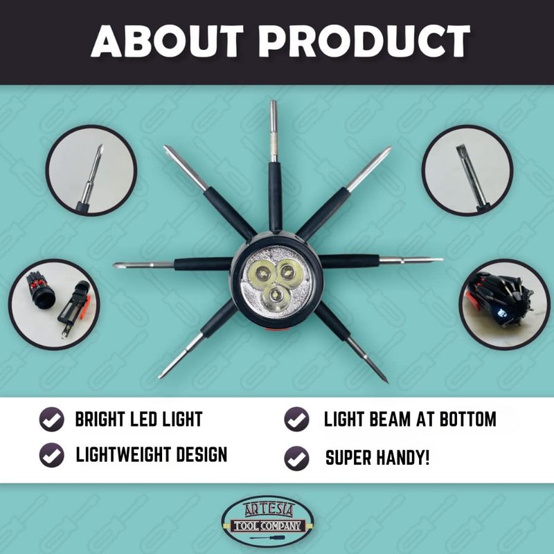 - MULTIFUNCTIONAL DESIGN: A 6" (15.2 cm) unit cleverly combining a flashlight surrounded by 8 screwdrivers for multipurpose utility.