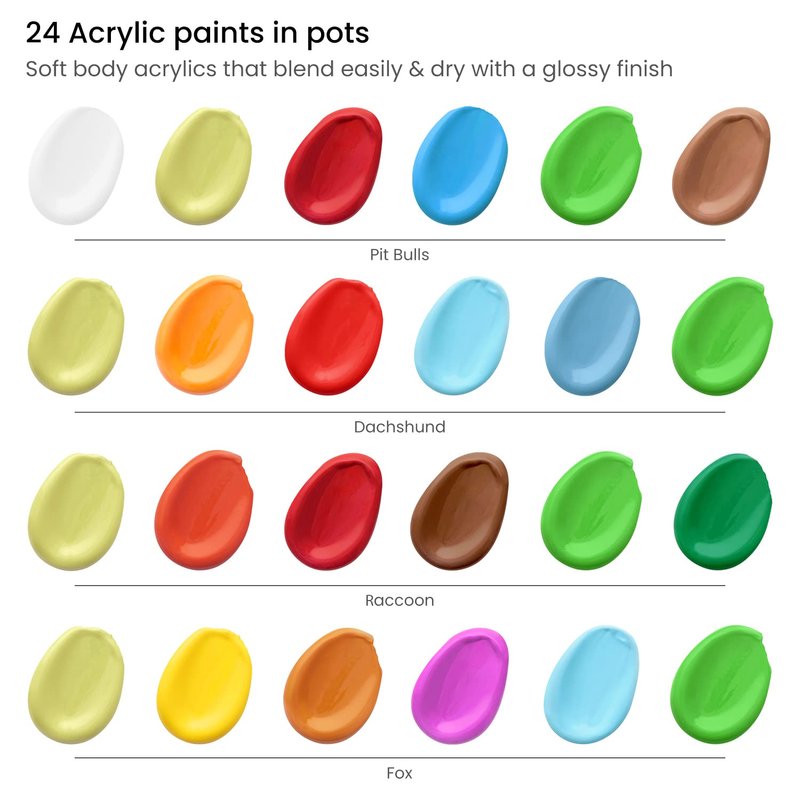 - Illustrate Your Imagination: Bring the fun of the Animal World into your home. This acrylic paint set comes with four different canvases depicting: a dog, a raccoon, a fox , and a pair of dogs. Your little artist can learn about colors and Fairy Tale while enjoying some artistic fun.