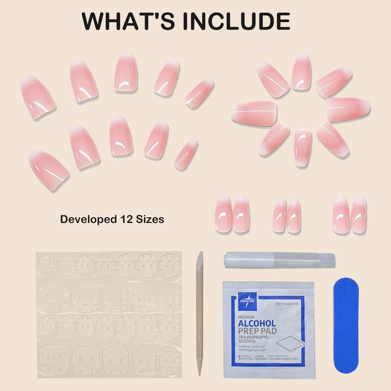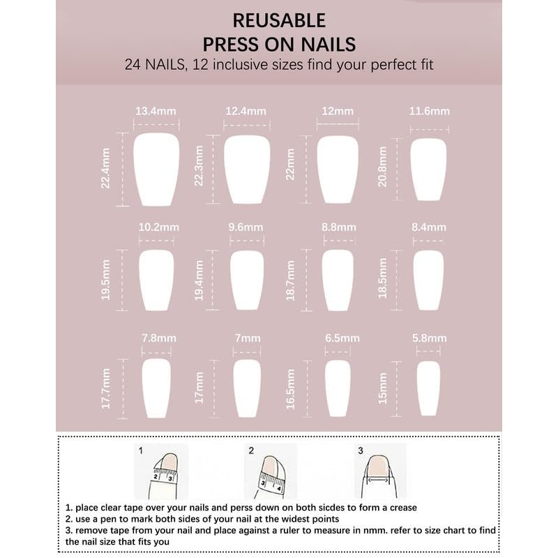 - Package Includes: 24 PCS short coffin press on nails in 12 different sizes, 1 x prep pad, 1 set x nail adhesive tabs, 1 x glue, 1 x nail file, 1 x stick. You can choose the size that best suits your own nails for a secure and comfortable fit