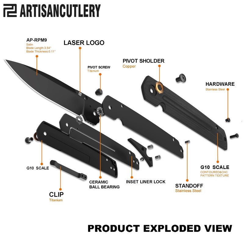 - The blade material of this pocket knife for men is ARTISANCUTLERY patent AR-RPM9 powder steel with black PVD .