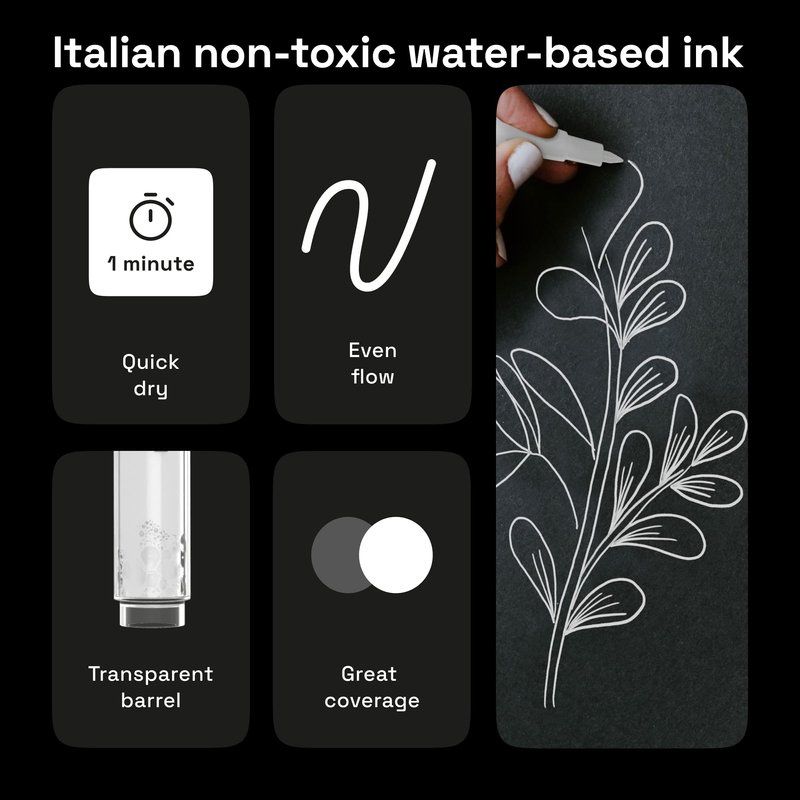 - Premium Quality: Artistro white paint markers utilize vivid, acrylic ink that dries quickly to produce a very durable opaque and glossy finish on almost all surfaces. These white ink pens are equipped with Italian ink and a Japanese nib to provide the upmost quality to any professional or beginner.