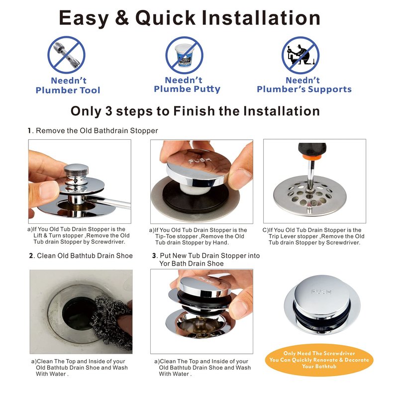 - EASY INSTALLATION: Installation easily without removing the old drain, so install Artiwell Universal Lift and Turn Bath Drain Stopper and Cover, you need’t professional plumber tools , plumber putty or plumber provide the support , you can save some costs.