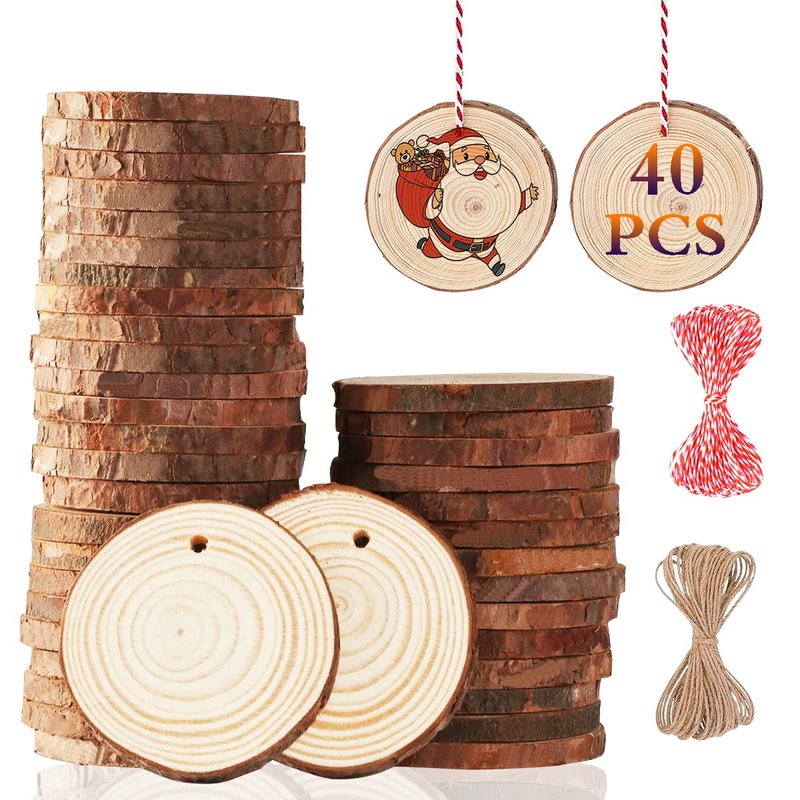 Artmag Natural Wood Slices 40pcs 2"-2.4" Unfinished DIY Crafts Predrilled with Hole Round Wooden Circles for Arts Rustic Wood Slices Christmas Ornaments Decor