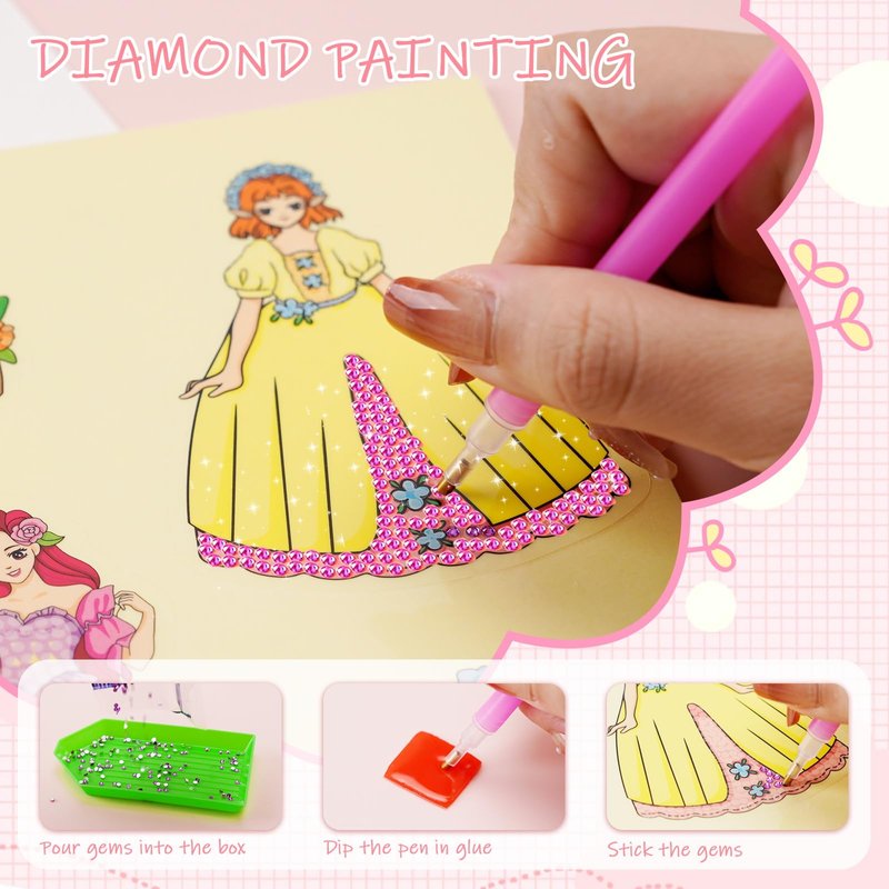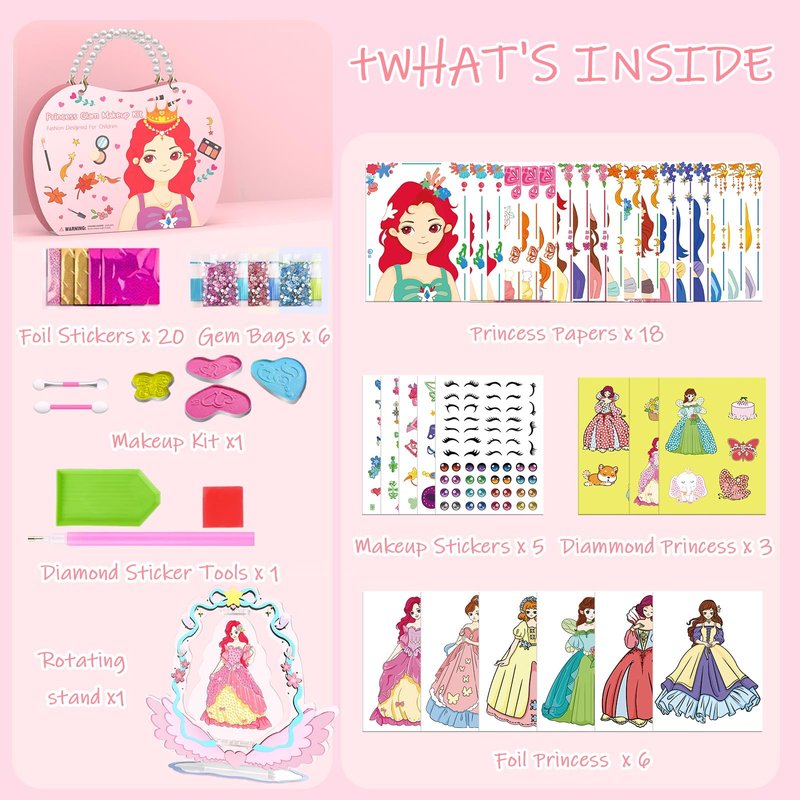 - 【5-in-1 DIY Arts and Crafts Kit】The dress up games set is a paper-based princess dress up arts and crafts for kids ages 8-12 that combines kids makeup, princess stickers, foil fun, diamond painting and a rotating stand in one. Unleash creativity with this captivating kit offering facial makeup, dazzling stickers for accessories, diamond painting for dresses, and glowing foil stickers for stunning makeover.