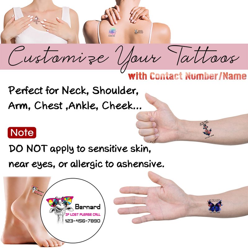 - OWN UNIQUE TATTOOS:Personalize the unique tattoos with your phone number & name for your kids! Customize the temporary tattoo stickers with phone number to apply to your kid's arm, hand and so on to avoid losing contact when they are lost. They can also be considerable gifts to babies children kids of your family,friends as birthday shower gifts or nice supplies when child going for school trip.
