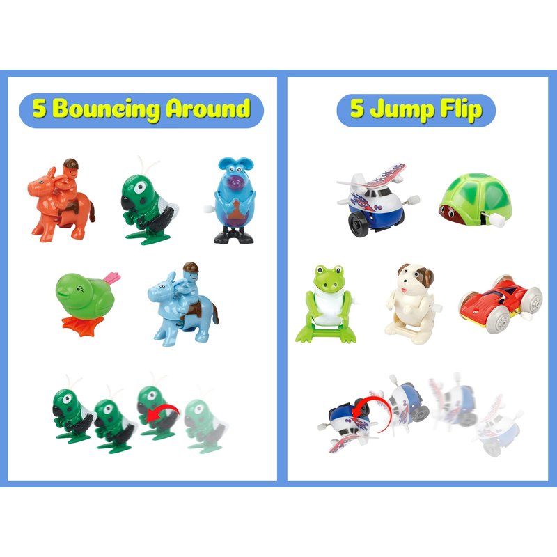 - Super Fun: Simply prime the clockwork mechanism, then each wind-up toy does a different trick such as Swimming in water, Flipping, Sliding, Spinning, Walking, Shaking head or tail and else.
