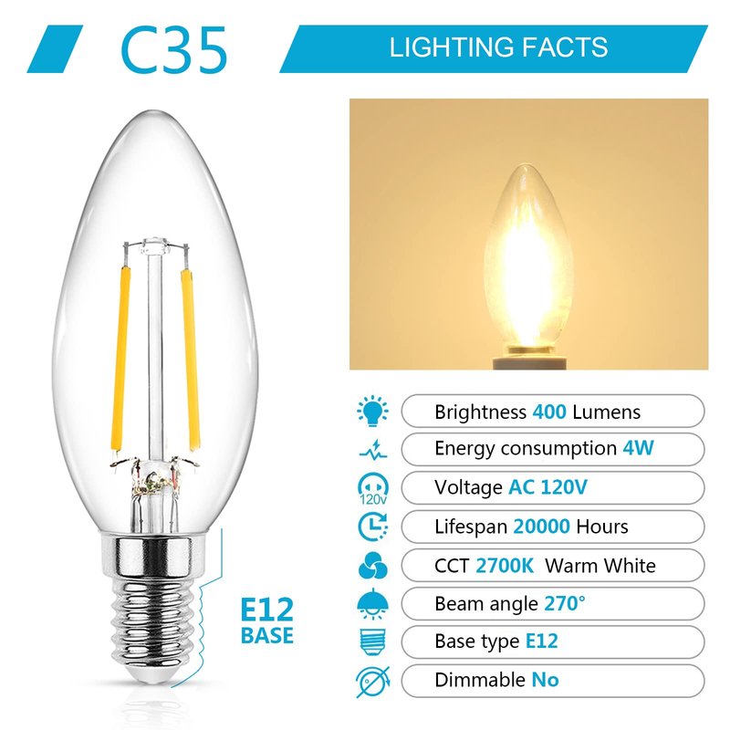 - Excellent Performance: Each e12 led bulb is Warm white 2700K, Not dimmable, 400 lumens, giving you a gentle and comfortable environment.