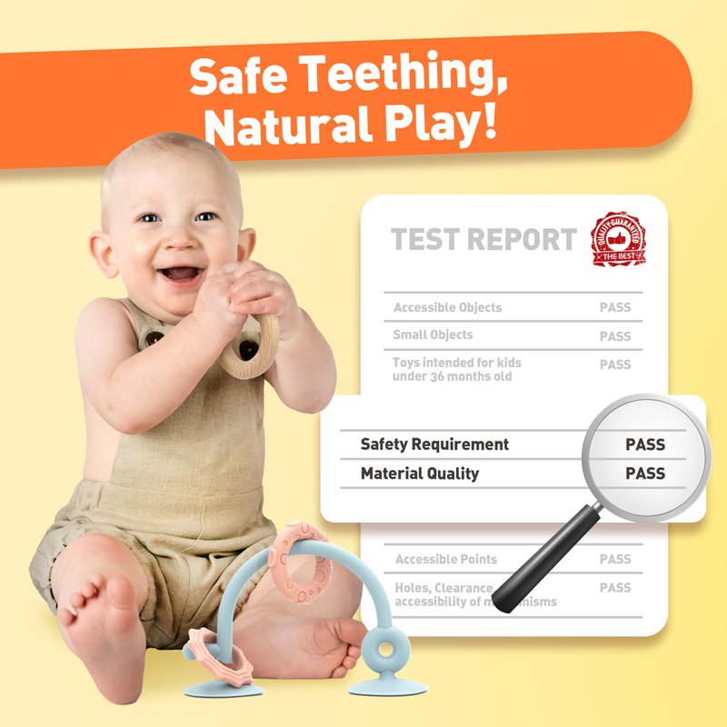 - πΏ Crafted for Child Safety πΏ - Composed of natural wood and BPA-free silicone, the suction toy is a safe choice for teething relief, providing infants with a harmless way to soothe their gums. Rest easy knowing your child is playing with materials that are rigorously tested for child safety.