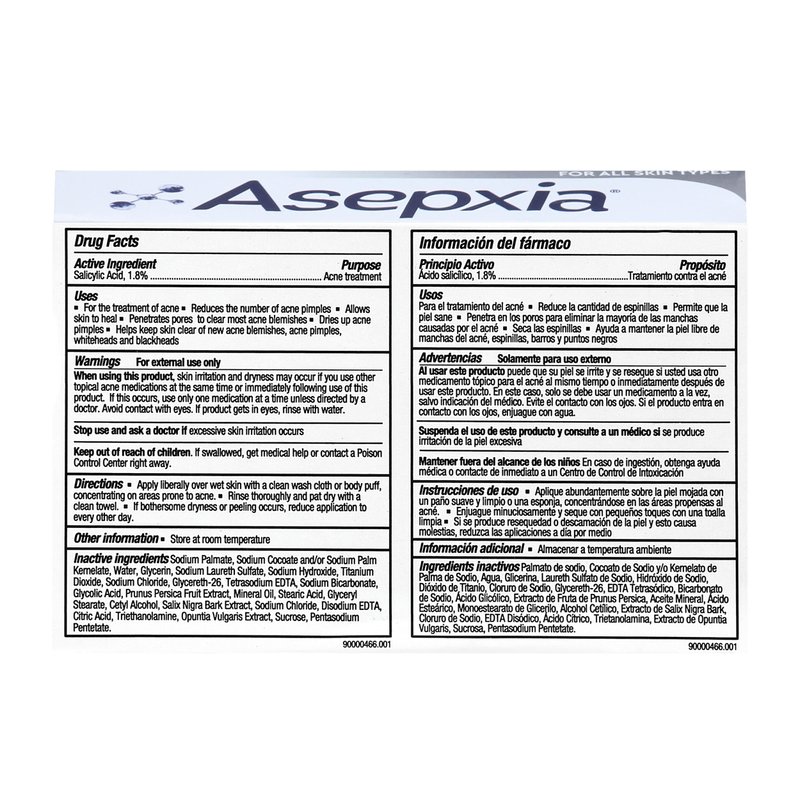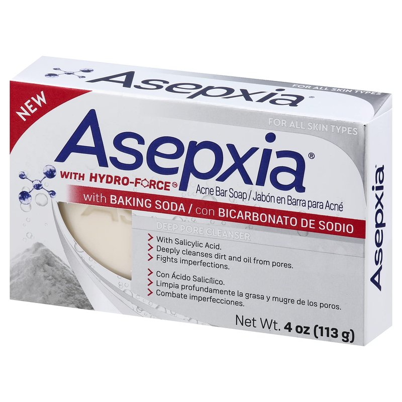 Asepxia cleansing bar soap with the power of baking soda deeply cleanses your skin while fighting imperfections. Enriched with baking soda and salicylic acid, its advanced formula hydro-force removes oil and dirt from pores preventing imperfections. Deeply cleanses dirt and oil from pores. Fights imperfections. Skin type: For all skin types. Asepxia, the skincare expert in deep cleansing that gives you the confidence you deserve.