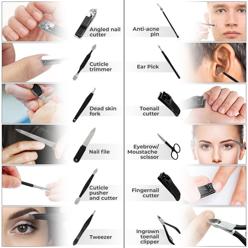 - Everything You Need: The ASH ISLAND professional nail kit comes with all the accessories you need to make sure your mani pedi is perfect! The set contains eyebrow scissors, tweezers, acne needle, an ear pick, nail cleaner, nail file, various sizes of clippers, as well as a dead skin fork and a peel knife, all packed in a compact travel case.