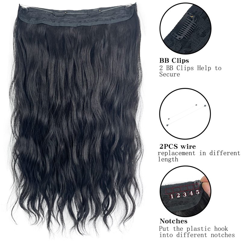 ASKUANG Halo Hair Extensions for Women Wavy Curly Hair Extensions Invisible Wire Adjustable Size Removable Secure Clip in Extensions (Black)