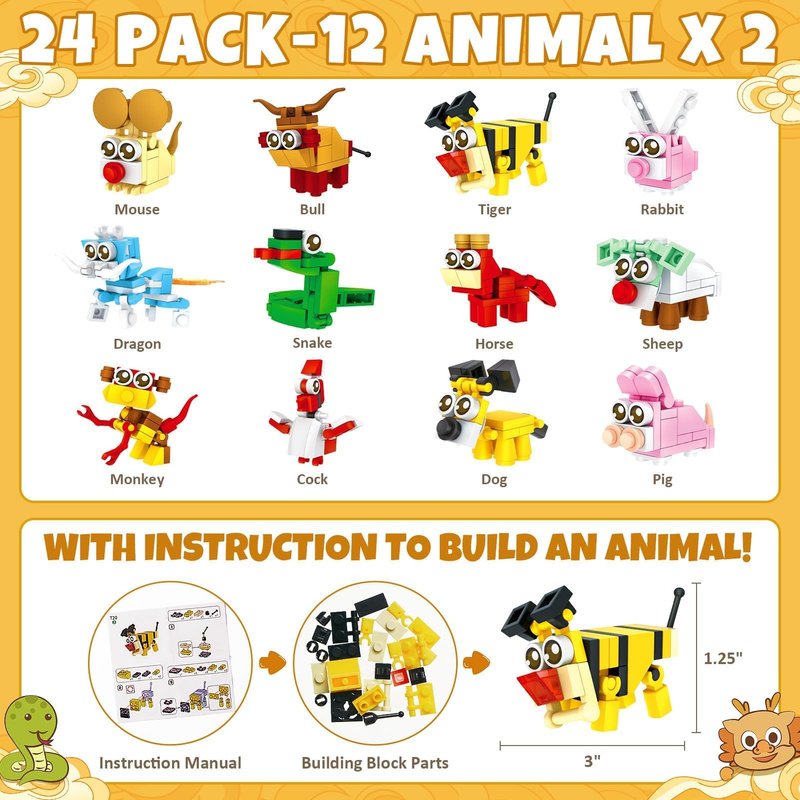 - 24 Pack Building Blocks Party Favors for Kids: Asoulin animal Building Blocks Set Birthday Gifts for Kids includes 24 PCS building blocks(12 models x 2) & 24 Cute Cards(6 designs x 4).These Building Blocks kids party favors goodie bags provide a funny way for kids exchange gifts, they can surprise their friends by giving these unique bricks gift bags. WARNING: CHOKING HAZARD- Small parts. Recommended Age Grading: 6+ years old