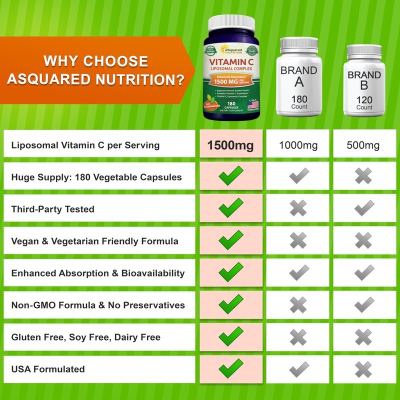- MAX STRENGTH FORMULA: aSquared Nutrition’s maximum strength formula is a 1500mg Liposomal Complex yielding 1350mg of fat soluble Vitamin C per serving, and 180 vegetable capsules in each bottle for a full 90 day supply. Don’t settle for other products that only offer 120, 90 or 60 capsules, tablets, softgels or pills, or that only provide 1200mg, 1000mg or 500mg per serving. Our fat soluble Vitamin C supplement ensures superior absorption and bioavailability. *