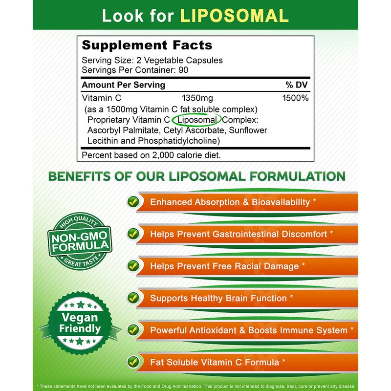 - NON-GMO & VEGAN FRIENDLY: Our proprietary Vitamin C liposomal formula is a 1500mg complex yielding 1350mg of fat soluble Vitamin C per serving (2 capsules), and is made with Sunflower Lecithin & Non-GMO Phosphatidylcholine. Our formula does not contain soy, gluten or dairy. Additionally, it is Non-GMO, Vegan & Vegetarian friendly, and does not contain preservatives. Our liposomal technology helps prevent gastrointestinal & stomach discomfort and works to optimize cellular absorption. *