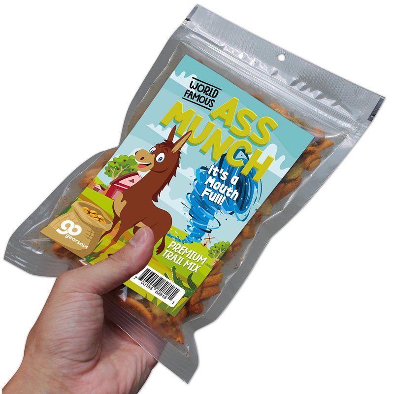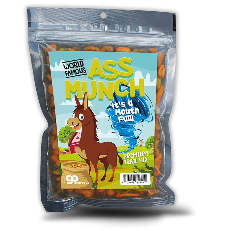 - IT’S A MOUTH FULL – Asses work hard all day, and it takes a special kind of fuel to keep them going. Keep your energy jackass strong with Ass Munch Spicy Trail Mix. It comes in resealable gift bags, so you and your friends can savor that hot ass flavor whenever the need arises!