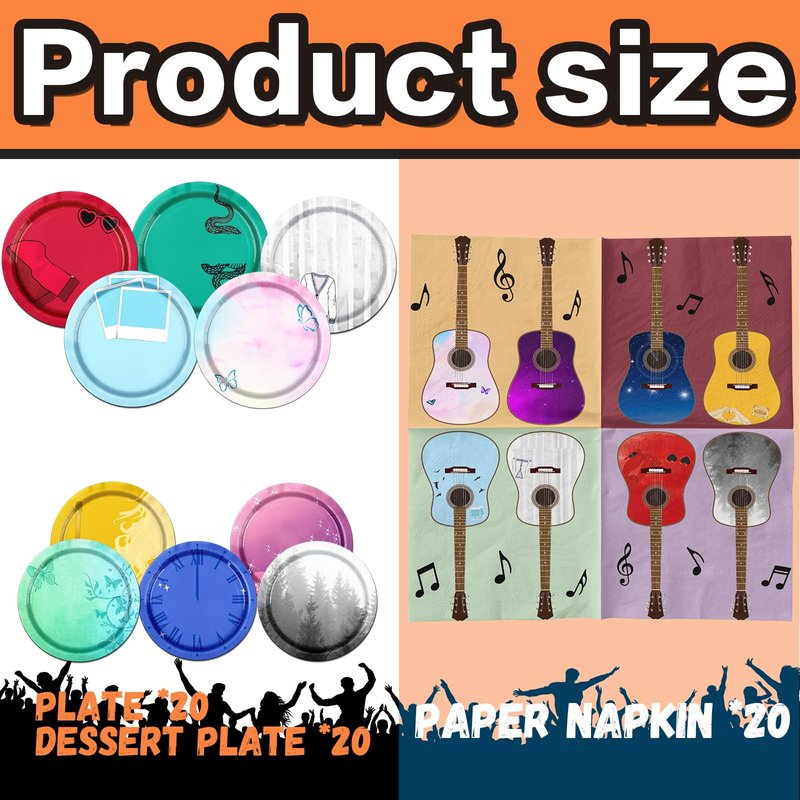 - WHAT YOU CAN GET:Do you want to have an impressive theme party?Look here!The Female tableware include 20pcs 9inch in my era plates,20pcs 7inch dessert plates and 20pcs music guitar napkins