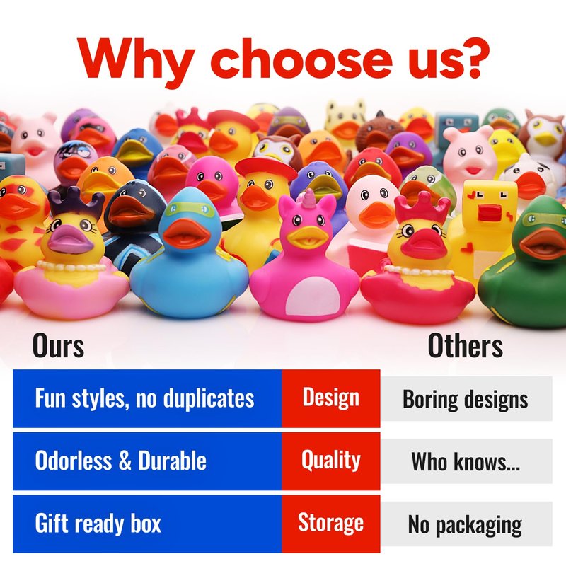 - Funny Rubber Ducks - If you want to start collecting little ducks for jeeps, then buying a box of Entervending brand kids activity toys is the right choice. Variety of colours and designs, convenient 2 inch size, beautiful gift box with 20 pcs inside.