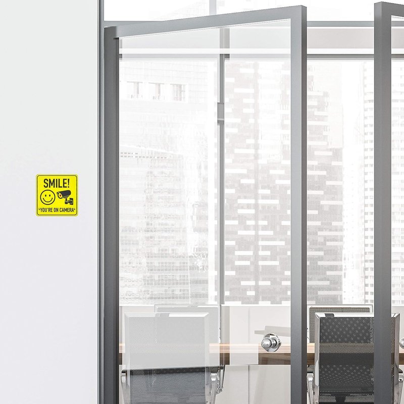 - π HOW TO APPLY: Thoroughly clean the surface that the smile your on camera sign will be applied to, removing any dust or loose particles before applying the adhesive. Remove the plastic sticker from inside the packaging and apply the sign to the surface area intended.