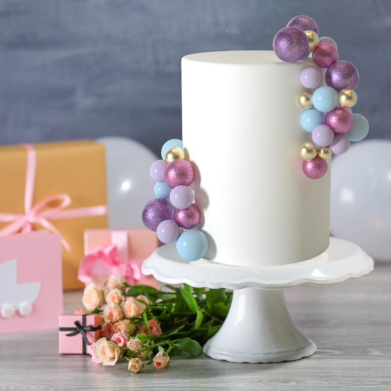 - Package includes: 50 pcs cake balls decorations with different colors and Sizes. They are glitter pink,glitter purple,light purple,light blue and gold colors as shown in the picture.
