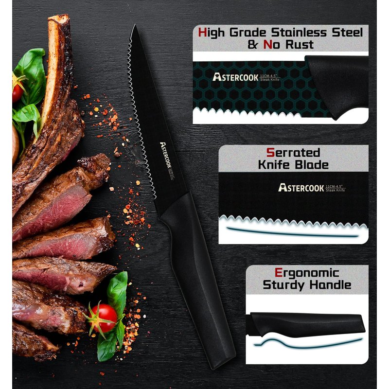 - 【HIGH-CARBON STEAK KNIFE】 Astercook steak knives set are uses a unique anti-rust, anti-stick and anti-oxidant coating, made of high-carbon stainless steel with exceptional corrosion resistance, which has long-term life