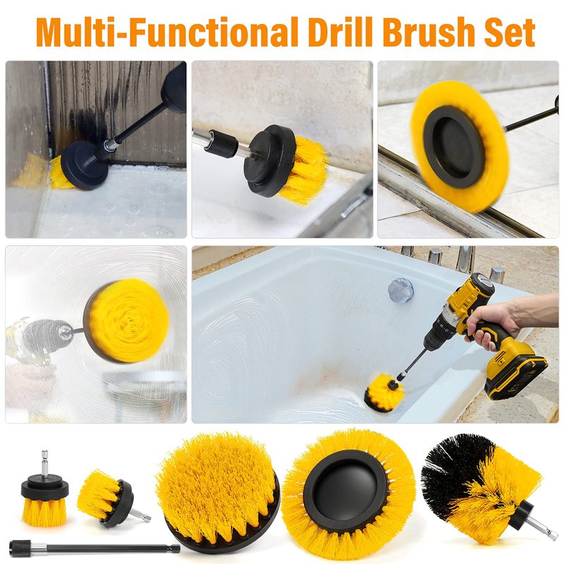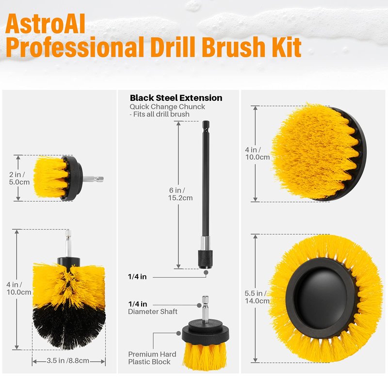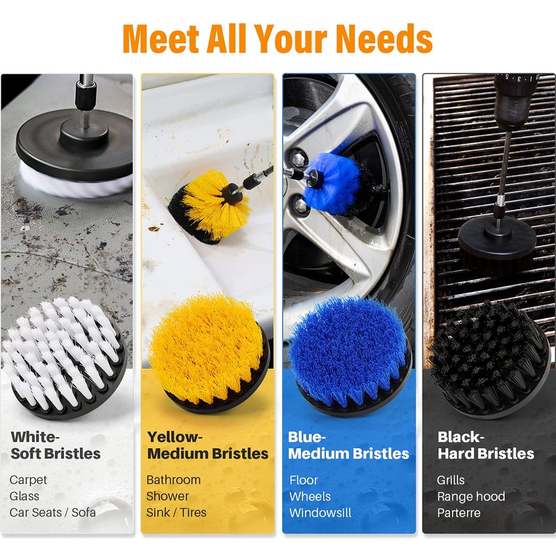 - Meet All Your Needs - AstroAI drill scrub brush is special designed, and its different colors correspond to soft/medium/hard stiffness nylon bristle to make sure you have the right drill scrub brush attachment to clean any area you need. The premium nylon bristles will not damage your belongings. Yellow power drill scrubber brush can be used to clean your car detailing, kitchens, living room, indoors, and outdoors.