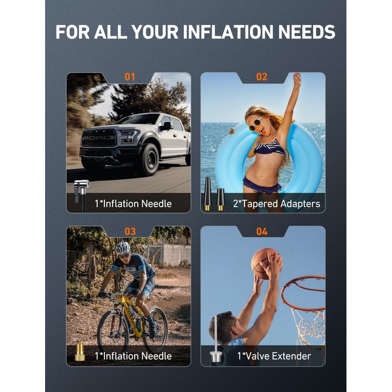 - MULTIFUNCTIONAL NOZZLES: The air compressor is equipped with 3 nozzles and 1 extra fuse. The included nozzles help the air compressor inflate a wide variety of products from tires on compact or midsize sedans,, SUVs, motorcycles and motorbikes to sports equipment like balls and more.
