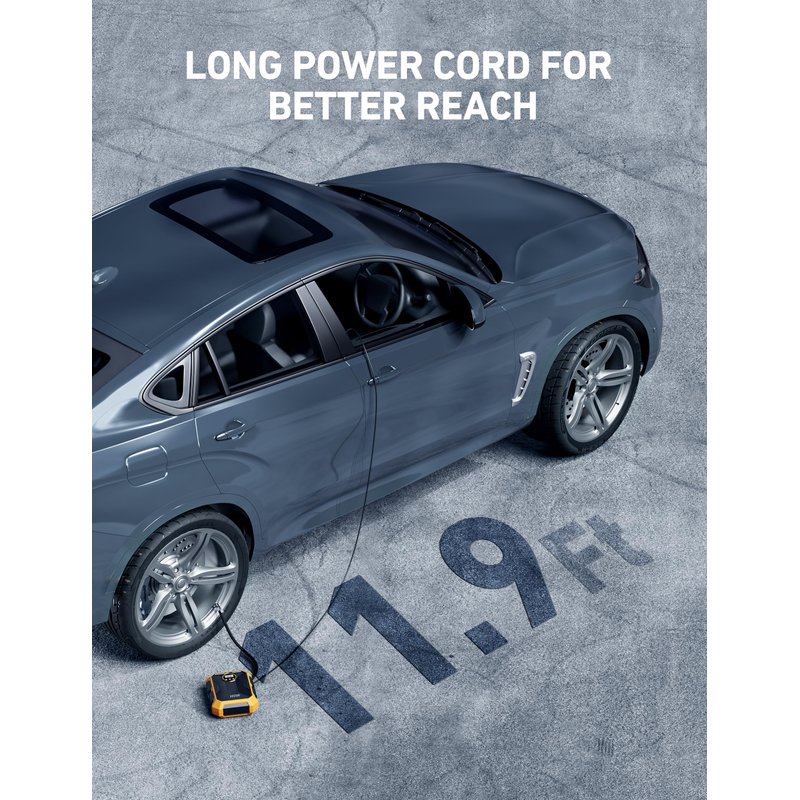 - Ultra-long Power cord & Compact: A 11.9ft long overall length gives easy access to the front and rear tires, saving you time and energy. The compressor’s compact size allows it to be easily stored anywhere in a vehicle. Even though it's compact, the air compressor delivers fast inflation.