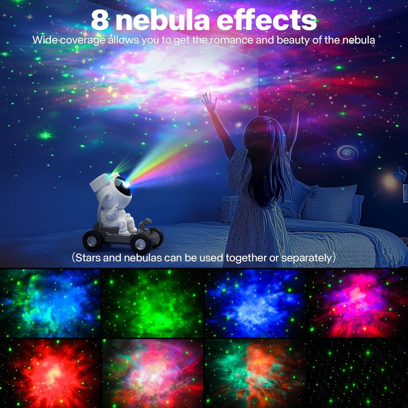- 【Two Control Methods】 The lunar rover starry sky projector can be controlled by the remote control and the buttons on the side of the vehicle body. The remote control can adjust the nebula color, brightness and flashing frequency, as well as the star mode and switch.. The buttons on the side of the car body can adjust the nebula, stars and power switches, giving you a convenient operating experience. Welcome to bring the unknown universe into your home!