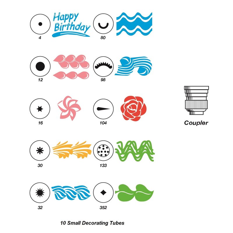 - Stainless steel tips included: 2, 4, 12, 16, 30, 32, 48, 80, 98, 104, 133, 352 - to make roses, shells, leaves, stars, scrolls, lettering and more