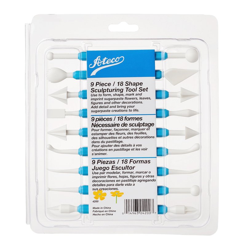 Ateco Sculpting Tool Set for Sugar Paste Decorations, 9 Piece Set with 18 Shapes, Food Grade Plastic with Non-slip Handles, Blue