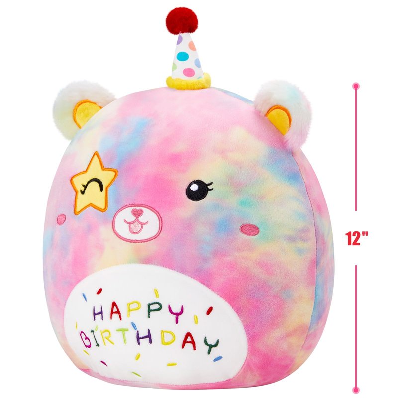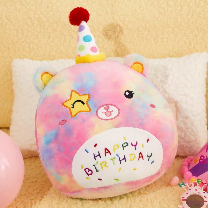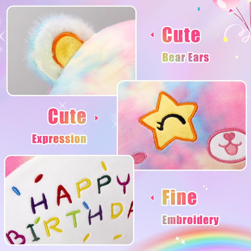 - BEAR BIRTHDAY PILLOW - Rainbow Bear Birthday Plush Pillow with Birthday hat and "HAPPY BIRTHDAY" lettering embroidered on Birthday bear's belly, with stars in the eyes, wink. It should be a nice choice if you want to give a meaningful gifts to your be loved ones. Add the birthday bear plush pillow to your plush pillows collection!