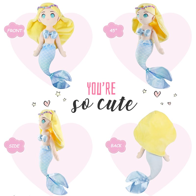 - ADORABLE MERMAID IMAGE-The cuddly mermaid soft plush doll has two twinkle big eyes and long thick hair with a beautiful string of pearls on the forehead. It wears blue cloth which makes it look like a real princess underwater. The mermaid princess has no legs but a colorful and big tail instead, it comes from fairy tales and wears a sweet smile on the face, girls all love it.