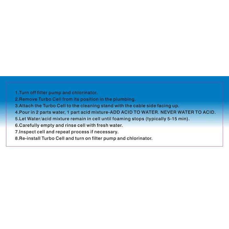 This turbo cleaning stand is designed to use with Hayward all turbo cells.Make cleaning your salt cell hassle free, help maintanence to prolong the life of your cell.No longer have to submerge your salt cell in a bucket for cleaning. Cleaning instructions: 1 Turn off filter pump and chlorinator 2 Remove Turbo Cell from its position in the plumbing 3 Attach the Turbo Cell to the cleaning stand with the cable side facing up 4 Pour in 2 parts water, 1 part acid mixture-ADD ADID TO WATER NEVER WATER TO ACID 5 Let water/acid mixture remain in cell until foaming stops(typically 5-15 min) 6 Carefully empty and rinse cell with fresh water Inspect cell and repeat process if necessary 8 Re-install Turbo Cell and turn on filter pump and chlorinator